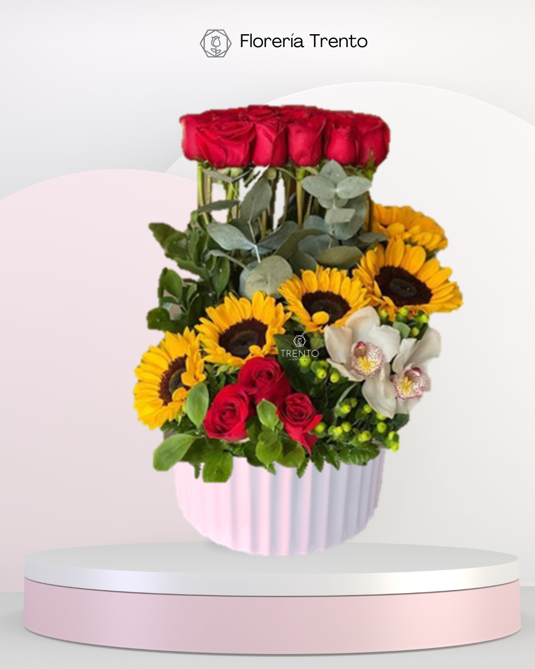 Este arreglo de rosas rojas y girasoles, es ideal para una ocasión especial.