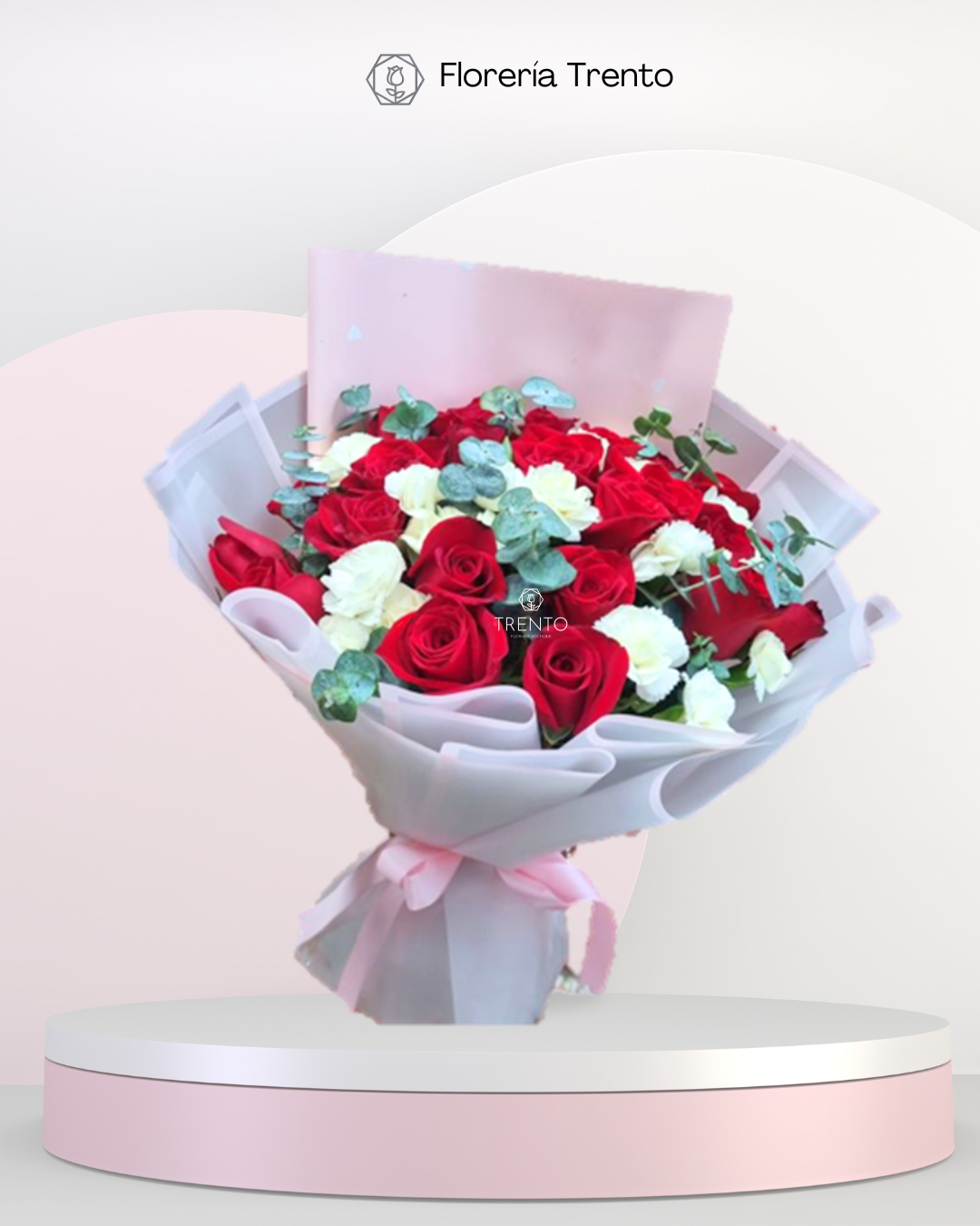 Regala este bouquet de 24 rosas rojas y claveles, es ideal para una ocasión especial.